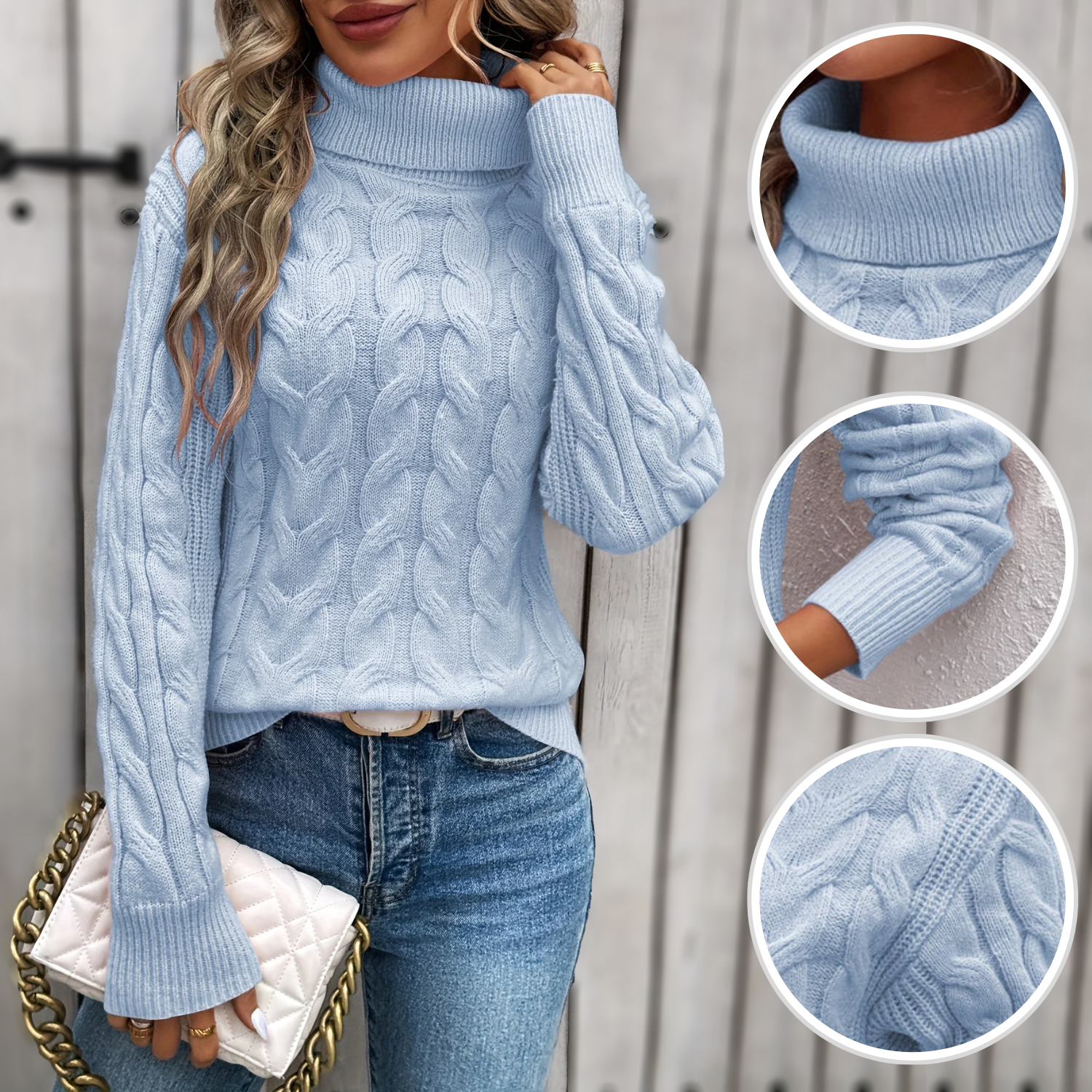 Discover the unique features of this elegant, warm textured turtleneck sweater: