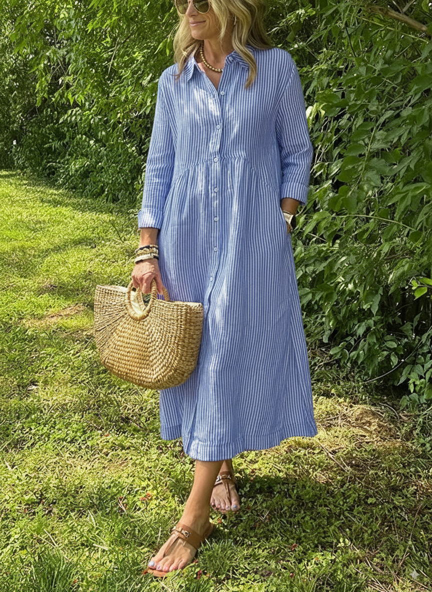 Timeless Elegance: Long Sleeve Striped Lapel Button Down Dress